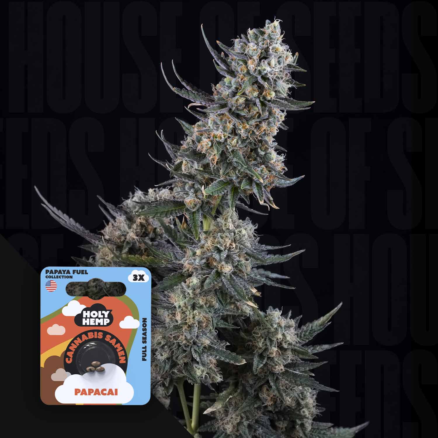 Papacai ist ein indica-dominanter Hybrid, der durch die Kreuzung von Acai und Papaya Fuel entstanden ist. Die Sorte überzeugt durch eine robuste, buschige Struktur mit kräftigen Seitentrieben und einer Höhe von bis zu 1,5 Metern. Sie benötigt etwa 56 bis 65 Tage Blütezeit und liefert dabei mittelgroße bis hohe Erträge, die sowohl im gemäßigten als auch im mediterranen Klima optimal zur Geltung kommen. Die dichten Blüten sind reich an Harz und mit einer intensiven Schicht von Trichomen überzogen, was nicht nur die Optik aufwertet, sondern auch auf die hohe Potenz hinweist. Schon während der Blütephase entfaltet Papacai ihr charakteristisches Aroma: eine süß-fruchtige Mischung aus Papaya und tropischen Noten, die von erdigen und leicht würzigen Untertönen ergänzt wird. Der hohe THC-Gehalt von rund 20 bis 25 Prozent sorgt dafür, dass die Sorte in puncto Stärke mit den besten Premium-Hybriden mithalten kann.